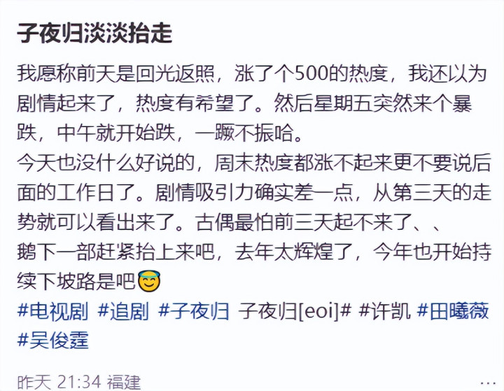 因为在许荔莎爆料之前,《子夜归》的热度就仍是横盘了,这意味着剧集本人就不太诱惑东说念主,但要是许凯没出这档子事的话,之后热度照旧有可能会冉冉爬升的。