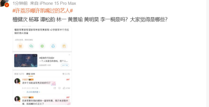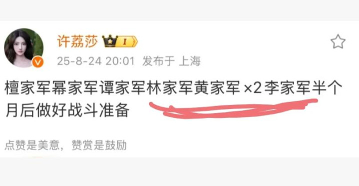 许荔莎在发完这篇动态以后不到一个小时就删了,但她的发文仍是把多位明星拖下了水,好多东说念主合计,这群被涉及的明星才是无妄之灾。