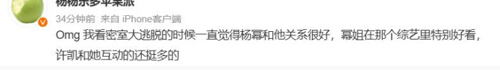 杨幂曾和许凯配合过一部剧,还当过团结档节目《密逃》的嘉宾,在节目上的互动也好多。