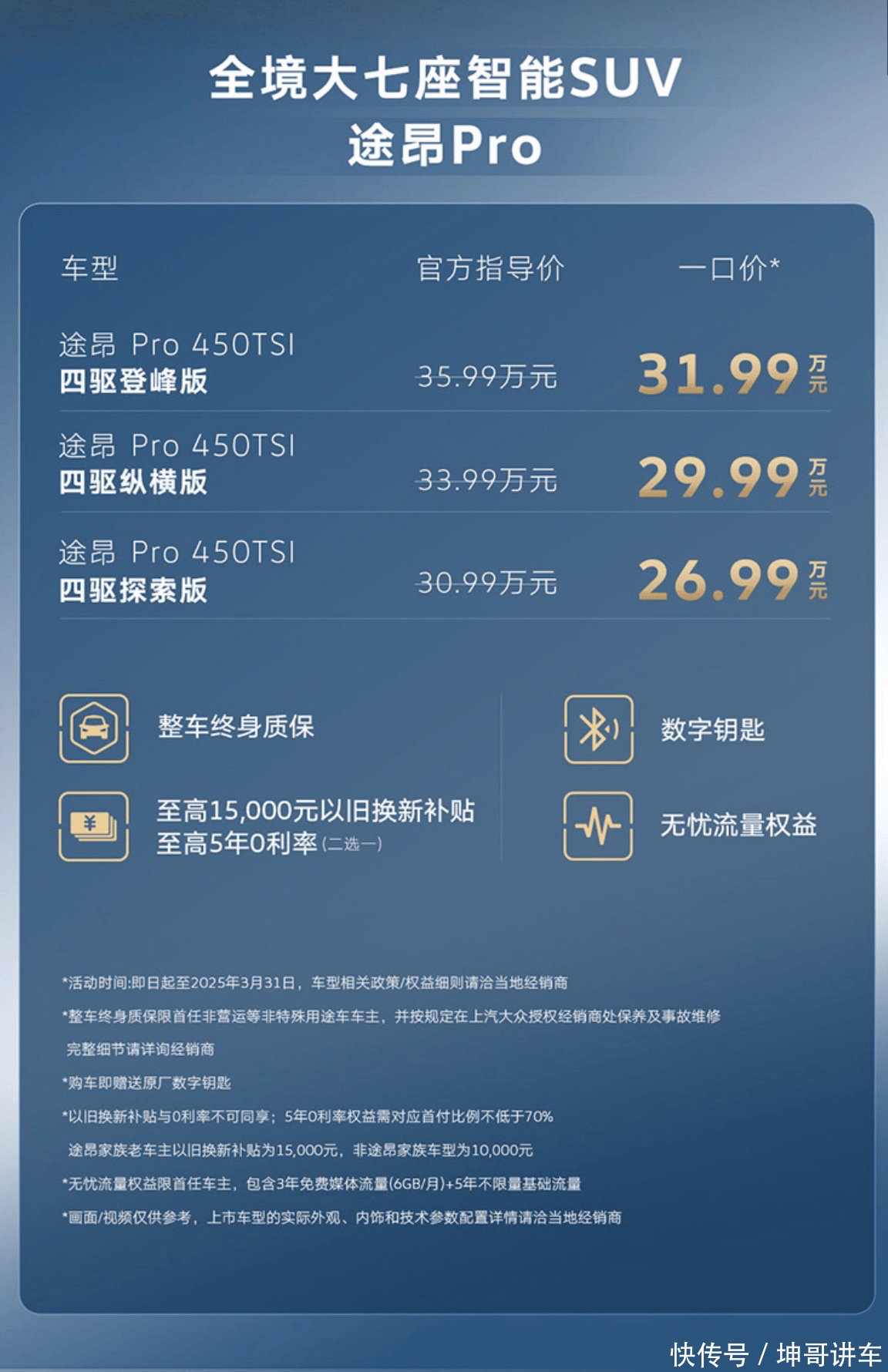 说完结途昂Pro的产物力,咱们再来聊聊订价。途昂 Pro一口价26.99万元至31.99万元,相较阛阓预期的38-42万元大幅下调。全系标配272马力发动机和多项豪华成立,初学即旗舰。26.99万元起售价,既在合股品牌中占优,又通过智能化加捏、保值率、矫健性与新能源车型抗衡。