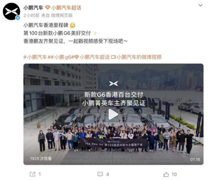 易车讯12月26日,小鹏汽车迎来香港里程碑本事,第100台新款小鹏G6致密在香港托付。把柄公开数据显现,新款小鹏G6首批车型本年11月致密到港,只是8周时辰就完成了百台托付。