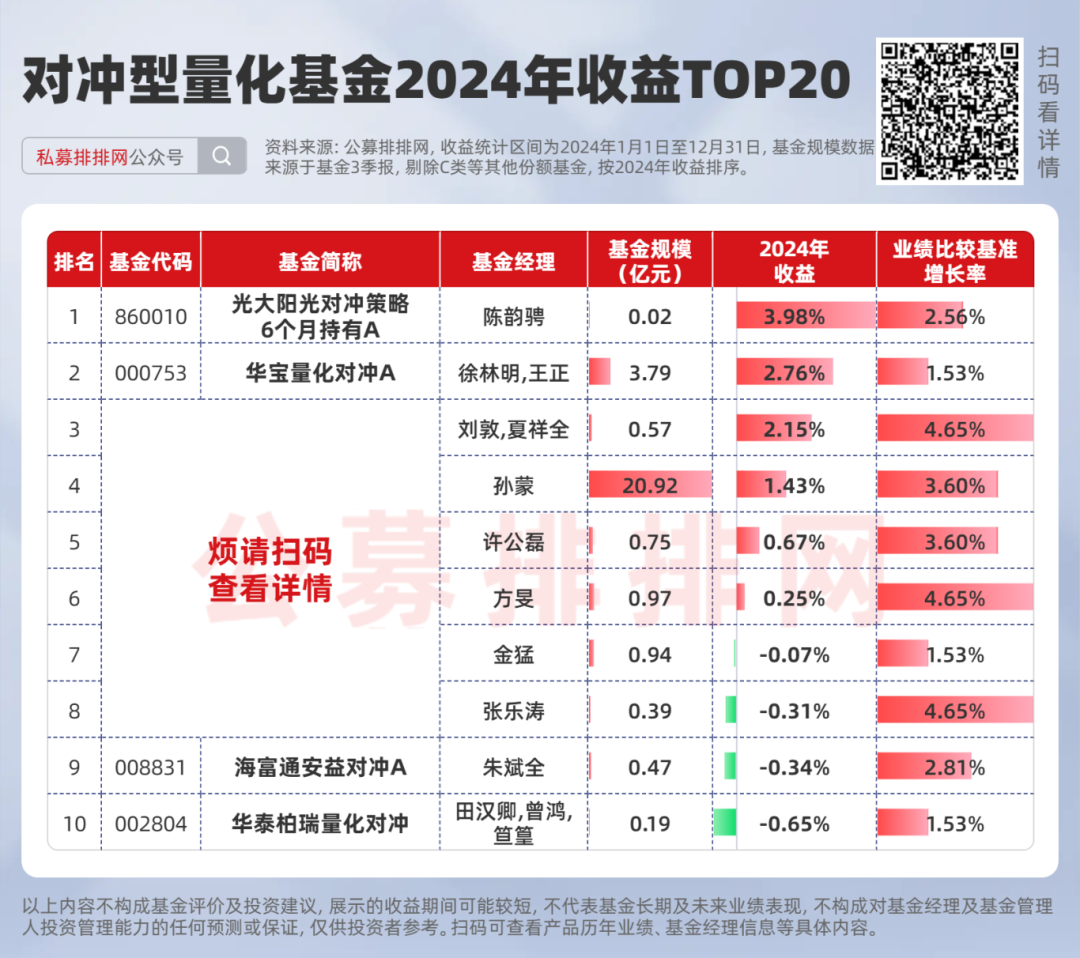 公募排排网数据炫耀,公募对冲型量化基金2024年收益均值为-1.45%,收益中位数为-1.58%,正收益占比为30.00%。按照榜单章程(剔除C类等其他份额基金),2024年收益居前2的产物分辨来自于光大基金、华宝基金。(点此查察完满榜单)