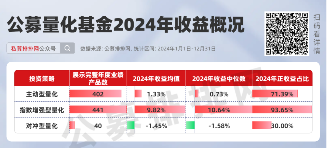 公募排排网数据炫耀,公募主动型量化基金2024年收益均值为1.33%,收益中位数为0.73%,正收益占比为71.39%。按照榜单章程(剔除C类等其他份额基金、产物鸿沟在1亿元以上),2024年收益前20的主动型量化公募基金如下。(点此查察完满榜单)