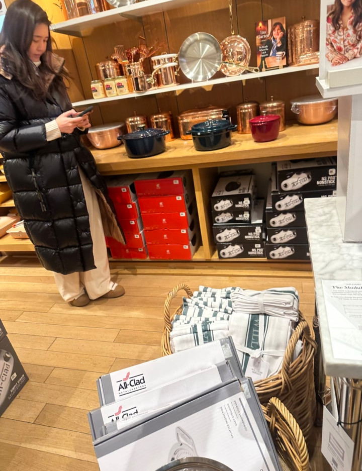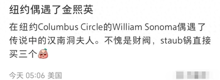 今天(1月25日),有网友发文称,在纽约市曼哈顿的地标哥伦布圆环(Columbus Circle)的Williams Sonoma(注:高端家家具牌)偶碰到了她,说她脱手富庶,staub锅平直买三个。