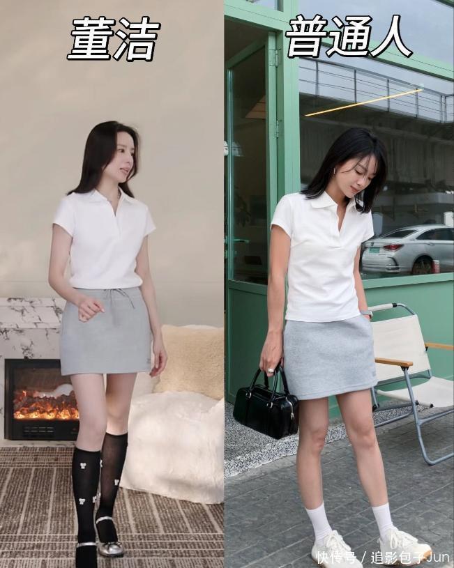 这套搭配偏指点风,用的是白色立领Polo衫加灰色指点小短裙,施展中带着小数失业,千里稳中又带着一点俏皮与轩敞。不外,比较较董洁的鞋袜搭配,我更倾向于平淡东谈主的搭配,会愈加顺应举座的作风。