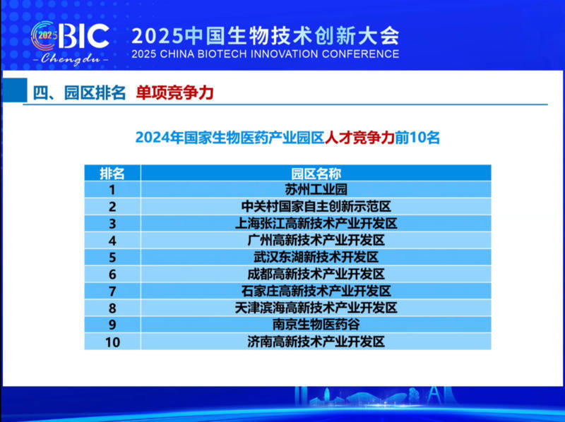 在东谈主才竞争力单项排名中,苏州工业园区、南京生物医药谷分别列第1名、第9名。