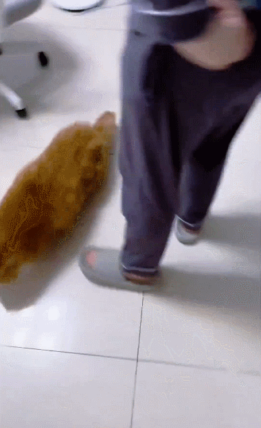 第一眼以为师父骑着猫?第二眼才看清是猫钻东说念主裤裆下面去。